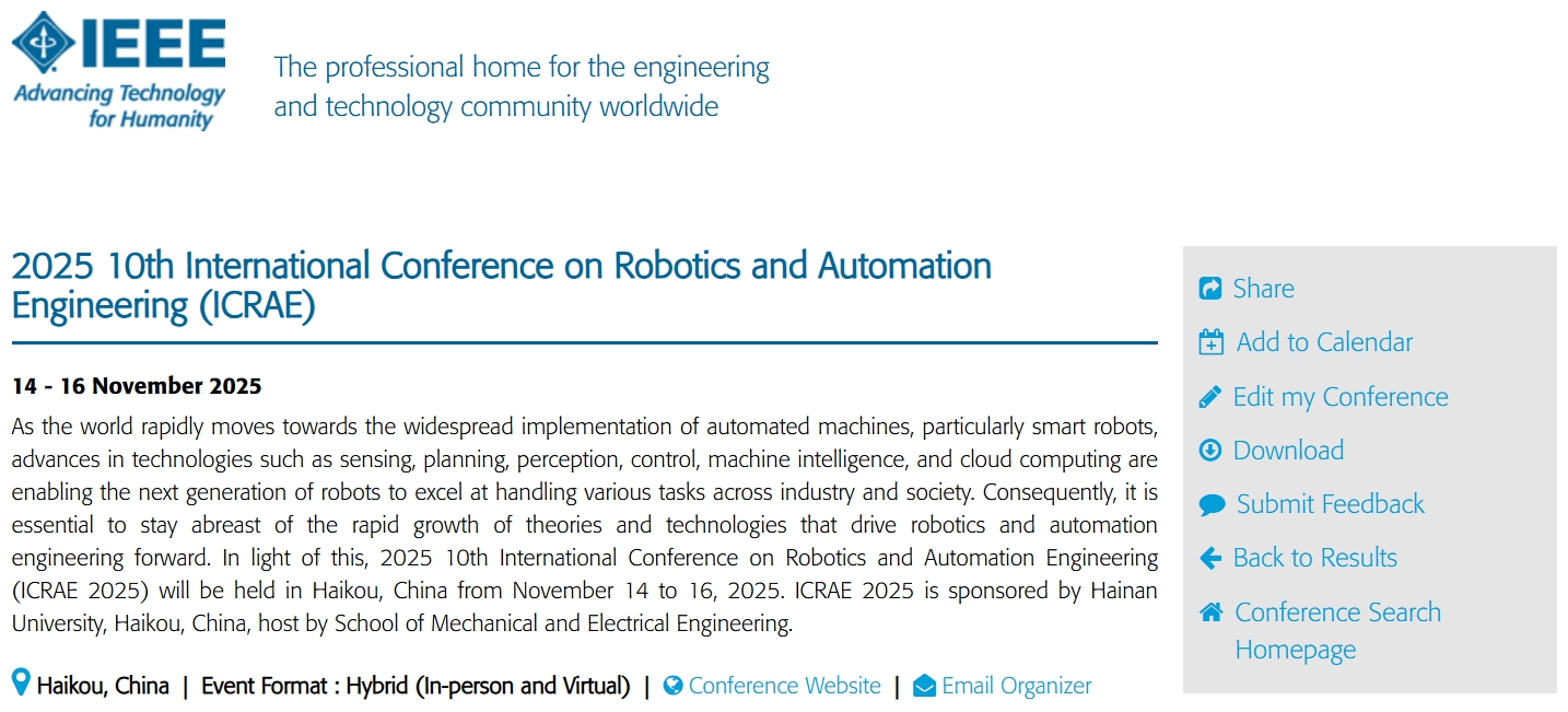 In light of this, 2025 10th International Conference on Robotics and Automation Engineering (ICRAE 2025) will be held in Haikou, China from November 14 to 16, 2025.
